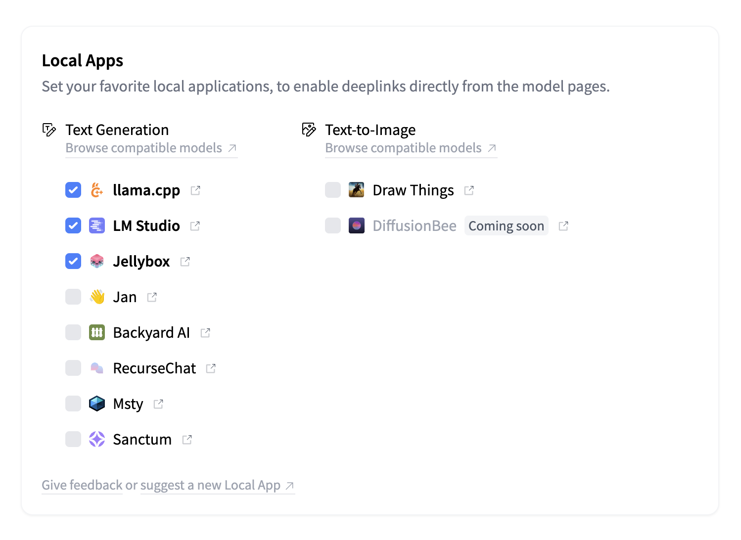 The list of available local apps is defined in https://github.com/huggingface/huggingface.js/blob/main/packages/tasks/src/local-apps.ts