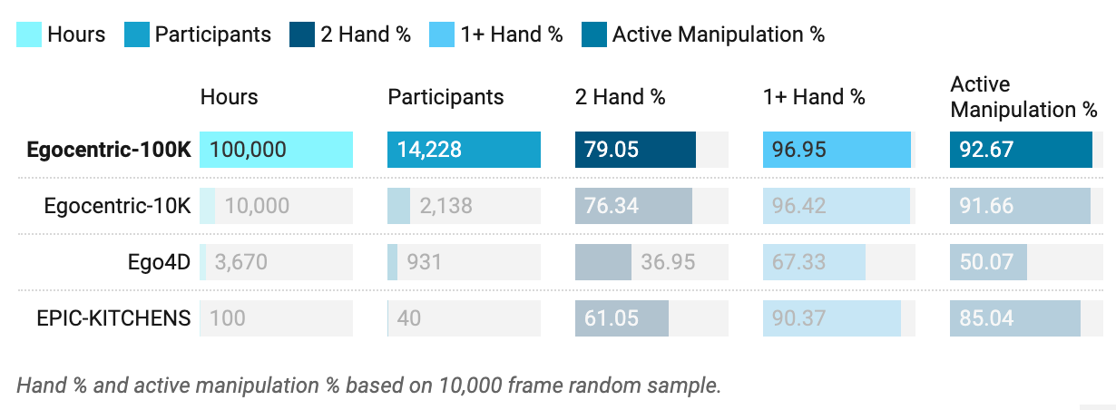 Egocentric-100K is state-of-the-art in hand visibility and active manipulation density compared to previous in-the-wild egocentric datasets. The complete 30,000 frame evaluation set is available at Egocentric-100K-Evaluation.