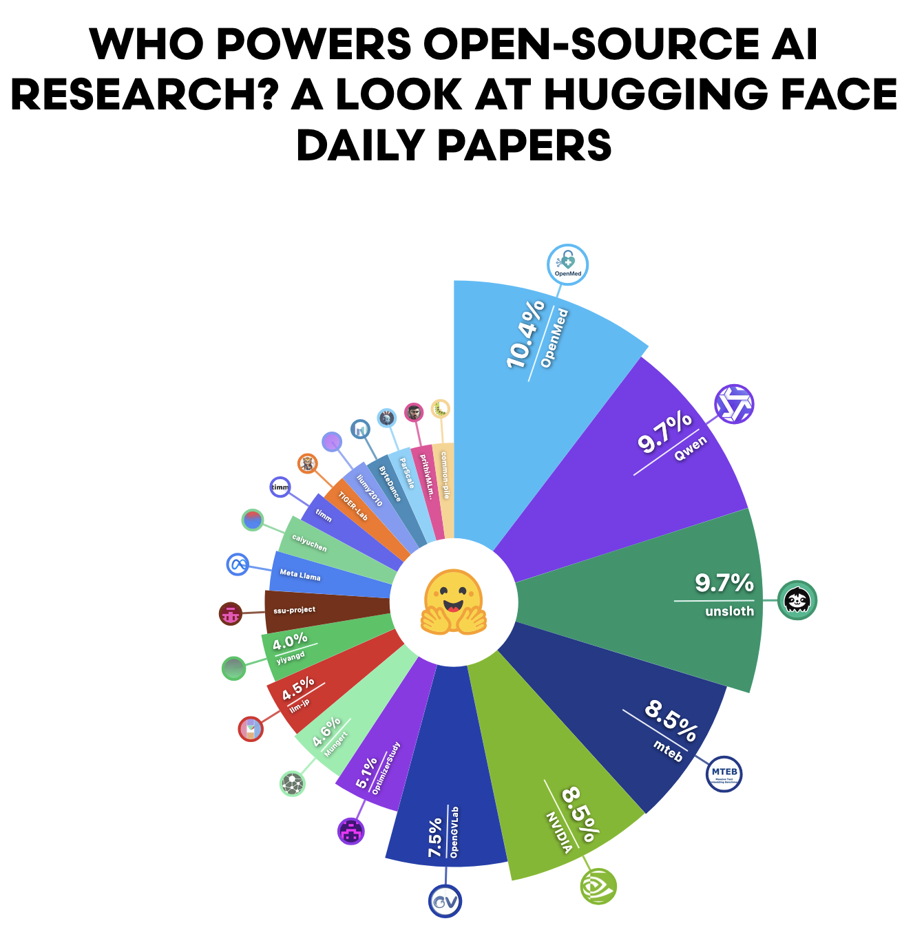 Of Hugging Face's Daily Papers, a set of papers curated by Hugging Face's AK, papers that reference model and dataset creation, showing the most open source adoption, are generally diverse. Prominent takeaways show medical papers being influential, while Big Tech's influence is sparse.